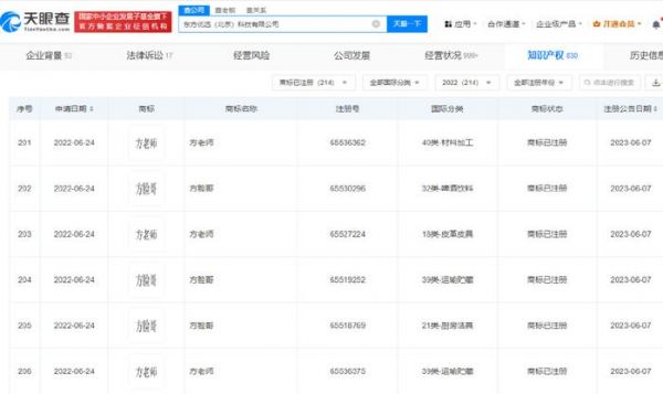 这些商标的国际分类包括广告销售、教育娱乐、办公用品、食品等,最早由东方优选(北京)科技有限公司于2022年6月申请注册,当时也正是东方甄选和董宇辉刚刚走红的时候。