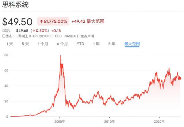 到2000年3月互联网泡沫达到顶峰时,思科股价反弹了71倍,但泡沫破裂后的几年内暴跌约90%,此后一直未能回到互联网泡沫巅峰时期。