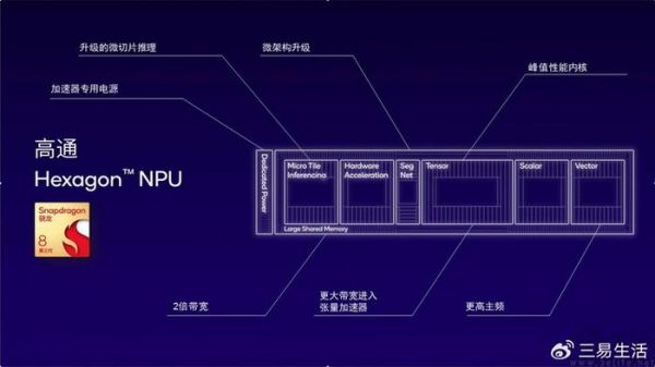 到最近这两年,第二代骁龙8和第三代骁龙8里的Hexagon NPU更是引入了众多技术提升。其中包括专用的电源传输轨道、专门针对神经网络处理的微切片架构、将张量加速吞吐量提升了一倍的INT4运算支持,以及大幅加速生成式AI运算速度的Transformer网络加速能力等等。