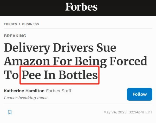 在如此严苛的条件下,不少亚马逊的送货司机被爆出会在车内准备水瓶上厕所,避免上厕所时间太长,被系统判定摸鱼。