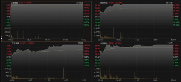 液冷服务器概念股爆发,拥有自制液冷机柜和冷热通道且主要应用于数据中心的日海智能周五收盘录得12天6板,可为服务器等散热领域客户提供液冷模组等散热产品的精研科技实现20cm涨停;在液冷技术方面持续加大数据中心节能技术研发的工业富联、推出数据中心专属液冷产品组合解决方案的统一股份、为浸没液冷智算产业发展联盟会员单位的光迅科技均实现涨停;在数据中心人工智能应用方面有液冷产品储备的川润股份周四收盘斩获四连板。