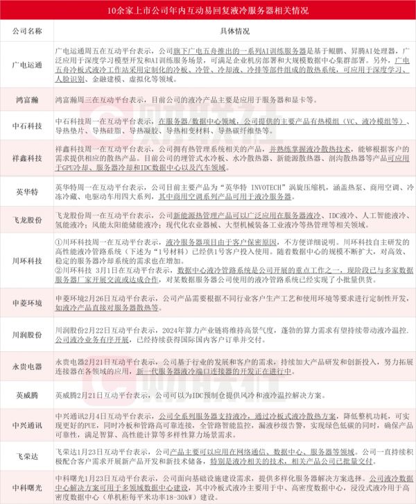 据财联社不完全统计,广电运通、鸿富瀚、中石科技、祥鑫科技、英华特、飞龙股份、川环科技、申菱环境、川润股份、永贵电器、英威腾、中兴通讯、飞荣达、中科曙光在内的13家上市公司年内回复液冷服务器相关业务情况。