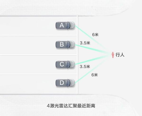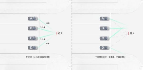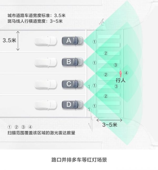 目前来看,最恶劣的场景莫过于大路口并排多车等红绿灯,行人从斑马线穿过的场景,并排4~5车道已经是非常大的主干道,激光雷达的数量并不会无限增加,如上图示意。
