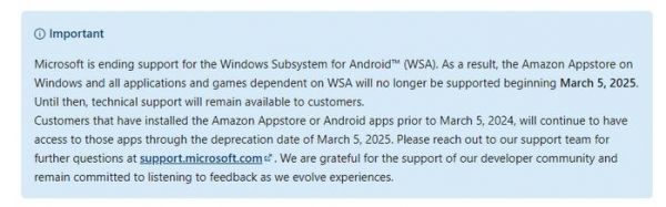 微软将终止对 Windows Subsystem for Android™️ (WSA) 的支持。从 2025 年 3 月 5 日开始,将不再支持 Windows 上的亚马逊应用商店以及所有依赖于 WSA 的应用程序和游戏。