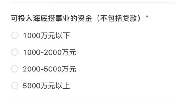 进入申请页面,开店省份必选3个省份,未来3年的开店数则最低“2家以内”;而在“可投入海底捞事业的资金(不包括贷款)”选项里,金额最低1000万元以下,最高5000万元以上。