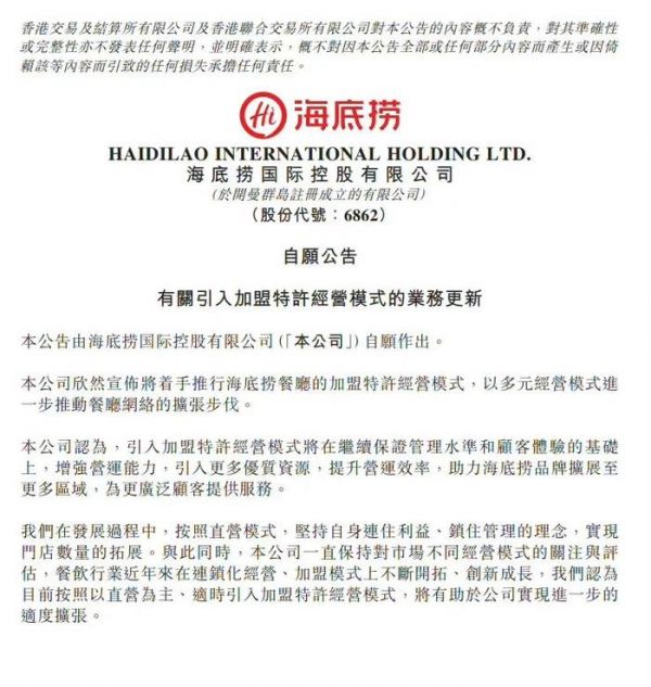 据海底捞公告,加盟餐厅将会获得集团统一提供的人员培训、供应链系统、品牌营销服务等中后台服务,确保食品安全及顾客体验。