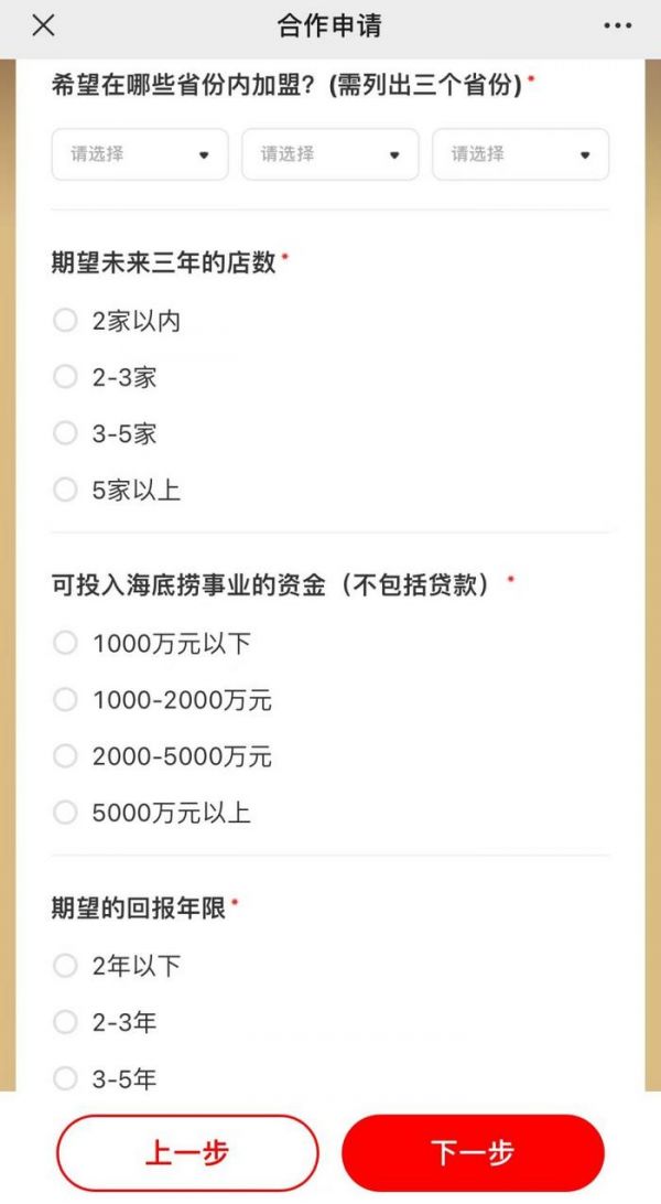 首先就是较高的资金门槛。申请者页面打开就能看到至少需要列出3个意向省份,未来三年期望门店数最低选项2家,可投入资金和个人总资产最低选项是1000万。