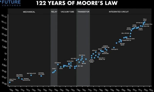 摩尔定律预测,集成电路上可容纳的晶体管数量大约每两年翻一番,这通常被解释为计算能力每两年大约翻一番。