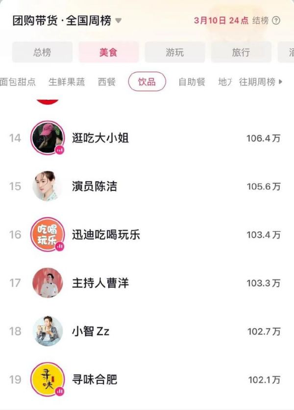 虽然是垂类头部,但36万左右的粉丝量在抖音整个带货生态中充其量只能算中腰部。在抖音团购带货榜上,饮品一栏中可以看到不少中腰部的达人。