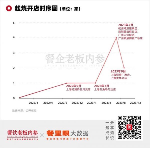 然而,从趁烧的公众号可以查阅到,品牌扩张速度却不尽如意。2022年9月至今,一年半时间,趁烧总共开出8家门店,现存3家。“3年百店”的目标更是遥不可及。