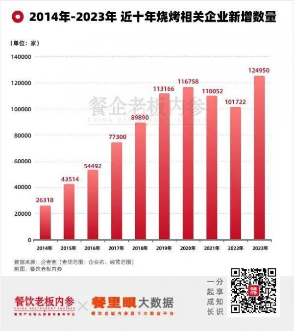 2023年烧烤赛道竞争白热化,新增烧烤企业数量达到历史新高,一年新增近12.5万家。企查查数据显示,我国烧烤现存企业56.6万家,相关企业注册量逐年增加。尤其在近五年,每年新增烧烤相关企业数量都达到10万家以上。