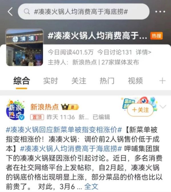 再看呷哺的“趁烧”和“湊湊”,前者大量收缩、盈亏难以平衡,而湊湊也在近几日冲上热搜,原因是#新菜单被指变相涨价#、#湊湊火锅人均高于海底捞#。顾客对于质价比的敏感程度可见一斑。