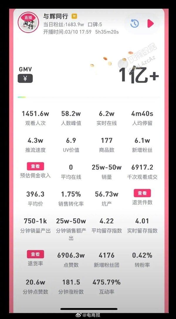 董宇辉晒新账号“与辉同行”成绩单:不到20天销售额高达8亿