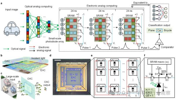 相关成果以《面向高速视觉任务的纯模拟光电计算芯片》(All-analog photo-electronic chip for high-speed vision tasks)为题发表在 Nature 上。