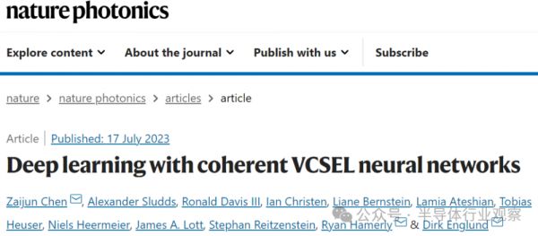 麻省理工学院(MIT)光学人工智能团队,首次提出将“时间-空间复用”应用在计算的光芯片设计理念,并采用光电效应做乘法和加法运算。2023年7月,相关论文以《Deep learning with coherent VCSEL neural networks》为题发表在 Nature Photonics 上。