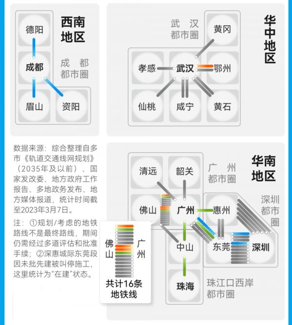 广州-佛山,上海-苏州,武汉-鄂州,杭州-绍兴,南京-镇江,郑州-许昌,成都-资阳,长沙-湘潭等跨城地铁的横空出世,就属此类。
