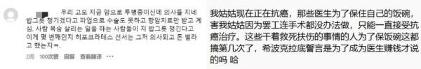 有癌症患者的家属分享了自己的故事,也对医生只顾自己的行径表示愤怒。