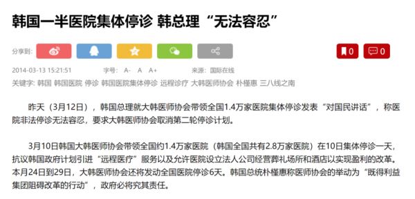 但不料遭到韩国医师断然拒绝。韩国医师协会认为这“会给韩国医疗产业造成严重影响”,因为“患者会都去大医院”。
