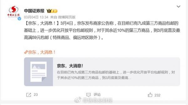 3月4日,京东发布公告称,在目前已有九成第三方商品包邮的基础上,进一步优化开放平台包邮规则,将在3月底普及最高满59元包邮。