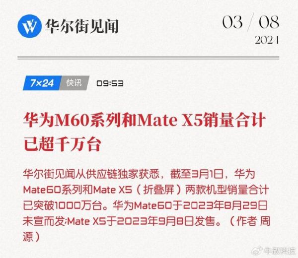 根据供应链消息,截至3月1日,华为Mate60系列加上华为Mate X5合计销量已经突破1000万台,这无疑超出了很多人的预期,华为也靠着这两款旗舰机型赚得盆满钵满。