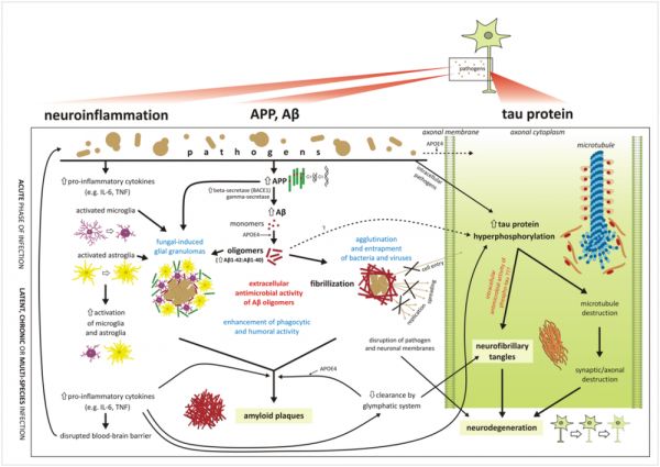 图1:图片展示了病原体感染中枢神经系统后,激活免疫反应,其中β-淀粉样蛋白累积便是消除病原体的手段之一,但随后也会形成淀粉样蛋白沉积斑块。来源:10.1371/journal.ppat.1010929
