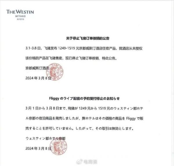 不过值得一提的是,就在飞猪推出“攻城价”之后,京都威斯汀酒店发布声明称,其从未授权该价格的产品在飞猪售卖,现已停止飞猪订单核销。