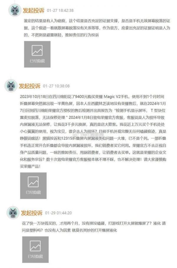 按:荣耀折叠屏手机屏幕、铰链故障频发,消费者质疑是产品缺陷。