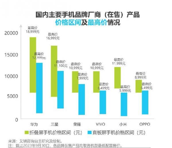 华为、荣耀、OPPO、vivo、小米等国产主流手机品牌都已经入局折叠屏手机市场。在苹果尚未入局的空窗期,国产折叠屏的发力成了突围高端市场的手段。艾瑞咨询一份报告显示,主流手机品牌折叠屏手机的价格区间大幅高于其直板屏手机。其中,荣耀、vivo、小米得益于折叠屏的助力,最高价突破万元。