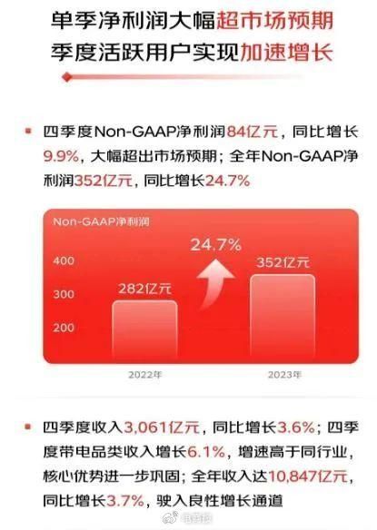 怀着这样迫切的心情,京东努力奋斗了一年,终于取得了些许成效。最新财报显示,2023年京东集团四季度收入为3061亿元,同比增长3.6%;全年收入达到10847亿元,同比增长3.7%。