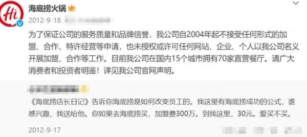 其实,早在2012年,海底捞一度传出“加盟风波”,但海底捞当时火速辟谣称,“为保证公司的服务质量和品牌信誉,自2004年起(《商业特许经营管理办法》正式颁发),不接受任何形式的加盟、合作、特许经营等申请,也未授权或许可任何企业与个人等,以公司名义开展相关工作”。