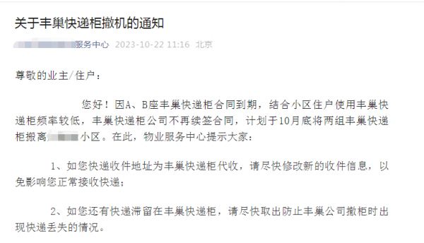 2023年10月,北京朝阳区的一家小区物业发布快递柜撤柜声明称,因小区内丰巢快递柜合同到期,结合小区住户使用丰巢快递柜频率较低,丰巢快递柜公司不再续签合同,并将两组丰巢快递柜搬离小区。