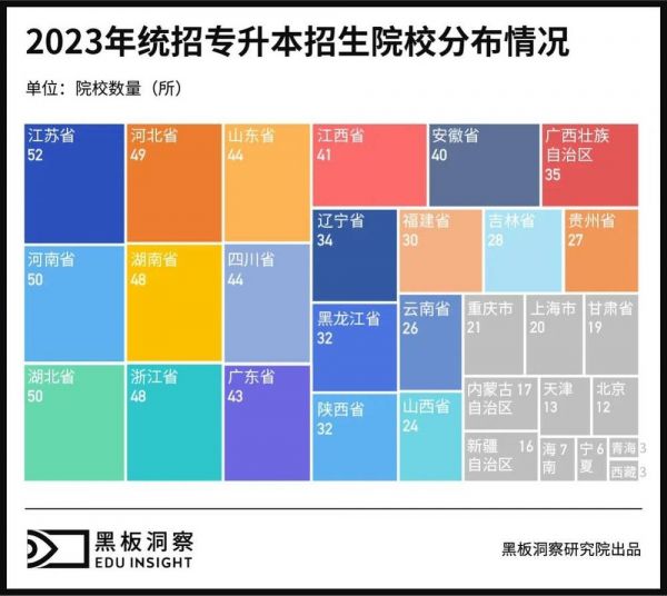 不过,即使是“含金量”不高的非公办院校,在部分省市地区,同样面临着“难上岸”的境地。十年前,河南省专升本录取率在61.11%,而去年则为40.45%,山东省则降至33%。同时,部分省市对于生源院校参加专升本选拔的学生比例也作出了一定的限制,即只有专科学校的部分优秀学生能够参加选拔,如北京、四川规定由生源院校推荐学生报考,人数不超过应届毕业生的15%。
