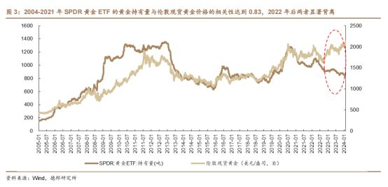 3. 空头回补阶段:2023年底随着黄金在区间顶部的时间越来越长,投资者开始意识到踏空行情,于是加大回补力度,黄金开始了对利率的不对称上涨;