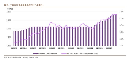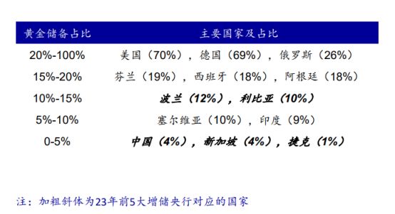 2023年前五大黄金增持国中,中国是黄金储备占比最低一档的国家,仅占4%,总量上仅与俄罗斯相当,以中国的外储体量,即便只增持到与印度相同的10%,也是未来黄金上涨的驱动力。