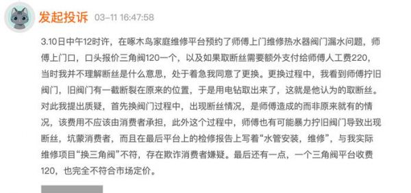 3月11日,有用户投诉称,在啄木鸟平台预约师傅上门维修,热水器阀门漏水问题,师傅上门,口头报价三角阀120一个,以及如果取断丝需要额外支付给师傅人工费220。在维修服务后,消费者发现,实际维修项目与检修报告不符,认为存在平台欺诈消费者嫌疑。