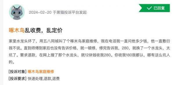 2月20日,有用户投诉称,啄木鸟乱收费、乱定价,换个12块钱水龙头收费280元……