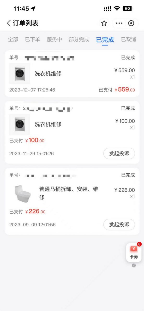 2023年11月29日,笔者家中洗衣机故障,于是在家庭维修平台啄木鸟下单,经维修后支付维修费用100元,一个月后,洗衣机再次故障,平台派了另一位师傅维修,最终检测结果是主板故障,维修费用559元。