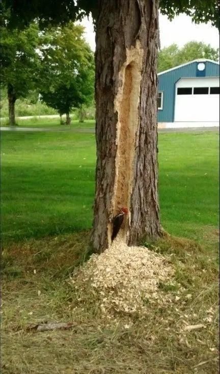 这是一只北美黑啄木鸟,正在给树木“治病”,但是看起来怎么有点不对劲,这是明显是在伐木,而不是捉害虫。