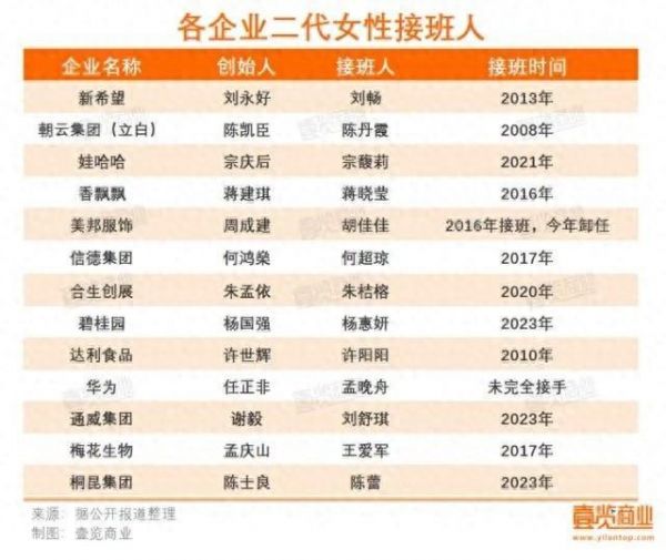 媒统计显示,包括娃哈哈在内,新希望、朝云集团、香飘飘等十余家企业都选择让女儿来接棒商业帝国,担任家族企业新一代掌门人,“女继承人时代来了”等话题随之登上热搜。而女性继承者们能够脱颖而出,有着多种原因。