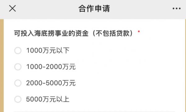 图片来源:海底捞加盟申请表,要参与海底捞“招亲”,1000万现金只是起步价。