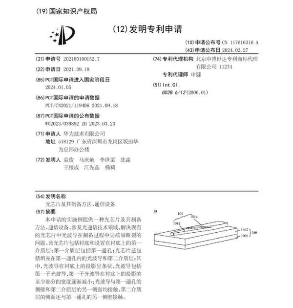 日前,华为技术有限公司就公布一项“光芯片及其制备方法、通信设备”的发明专利,这项专利申请日期为2021-09-18,申请号为CN202180100152.7。