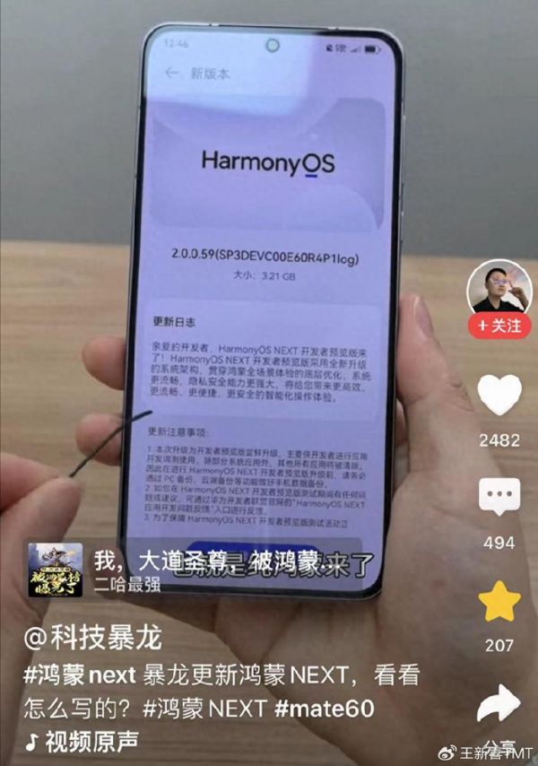 目前有博主曝光Mate60已经更新了鸿蒙NXET开发预览版,表示鸿蒙NXET将贯穿鸿蒙全场景底层优化,系统更流畅,是一款更安全,更智能化的操作系统,这意味着纯血鸿蒙或即将更快到来。