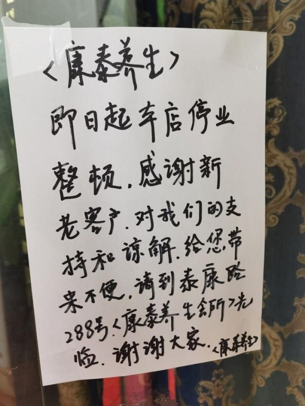 3月6日,记者来到曹杨路333号4楼看到,泰康的上一家名为“竹SPA”,店招还摆在玻璃门一侧没处理掉,而春节前还在揽客充值的“泰康”竟已关门大吉,门上张贴的一张A4纸则宣称已“停业整顿”。玻璃门里面,“年终钜惠”农历新年充值送优惠的广告易拉宝还摆放着。对面一家酒店公寓的工作人员称,过去一年,这家足浴店的老板如走马观花般更换,都是促销充值后没多久就关门换人。据称下一家已经在张罗进场了……但记者查询工商登记信息发现,过去一年,曹杨路333号4楼地址的经营主体实际并没有任何变化。