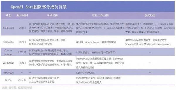 Sora就是一个例子,它背后的团队包括两名研发负责人Tim Brooks和Bill Peebles,系统负责人Connor Holmes,以及12名核心成员,博士带队,00后参与,成立还不到一年。