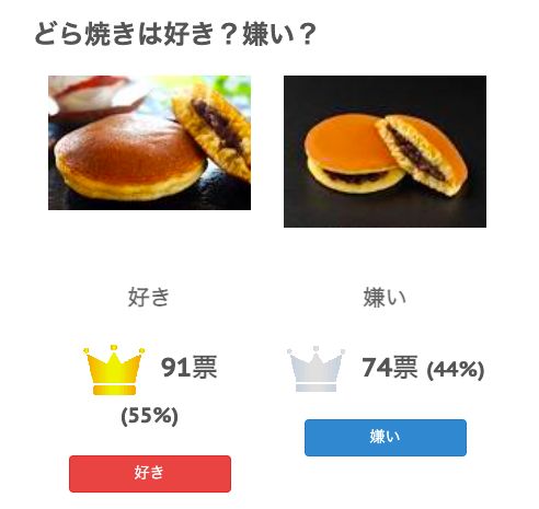 最后,我们再来看铜锣烧在日本的演变。在日本投票网站 tohyotalk 上发起的一项是否喜欢铜锣烧的投票中,喜欢组获得 91 票(55%)、不喜欢组获得 74 票(44%),通过评论区大家的留言也能大致感觉到经典如铜锣烧也要不断迭代以适应大家的偏好演变,譬如太甜、胚体干等等。
