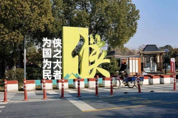 2024年1月28日,浙江海宁。金庸旧居外伫立着各种武侠元素的装置。(图/武睿超)