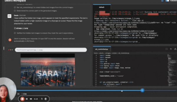 这本来是 Devin 不熟悉的技术,但它通过自行阅读和学习知识,三下五除二输出了带有用户英文名字的电脑壁纸。