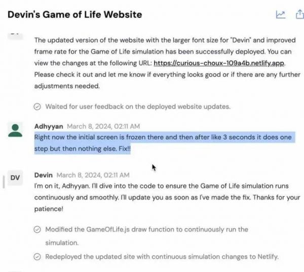 几乎就像一个人类同事!当 Devin 遇到问题,我给它建议时,就像在管理一名初级工程师。