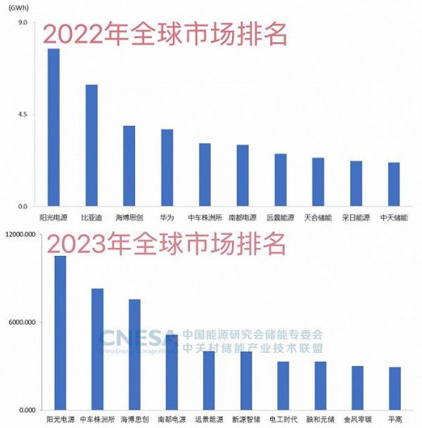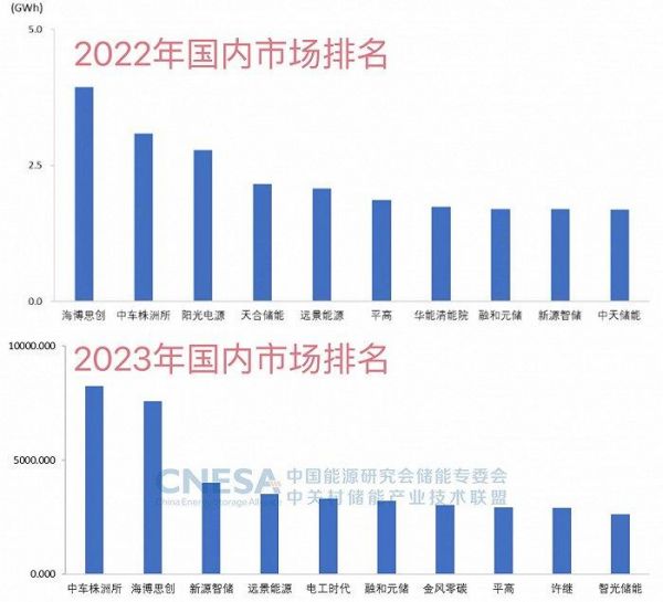 例如,国内市场排名中,中车株洲所超越海博思创成为第一;2022年排名第九的新源智储,去年跃升至全国第三;2022年分别位列第三和第四的阳光电源(300274.SZ)和天合储能,均不在去年榜单上;电工时代、金风零碳、许继、智光储能成为2023年榜单的新晋者。