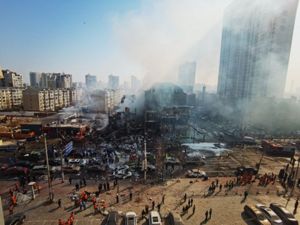 爆炸发生的简易楼,北侧楼体已经坍塌,看不出原来的样子;南侧一部分只剩下框架,另一部分依稀可以看到店铺的名称。救援现场有大量消防员和医生,以及维持治安的民警和清运垃圾的环卫工人。